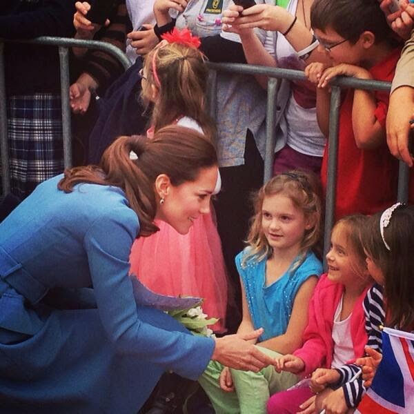 The Duchess was back in one of her favourite labels for the day, wearing a cornflower blue coat by McQueen. But it was her decision to wear her hair in a looped ponytail that really grabbed everyone's attention - it's Kate's first different do of 2014.